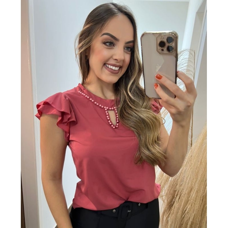 Blusa Feminina Em Crepe Regata Com Laise E Bot es SERENA