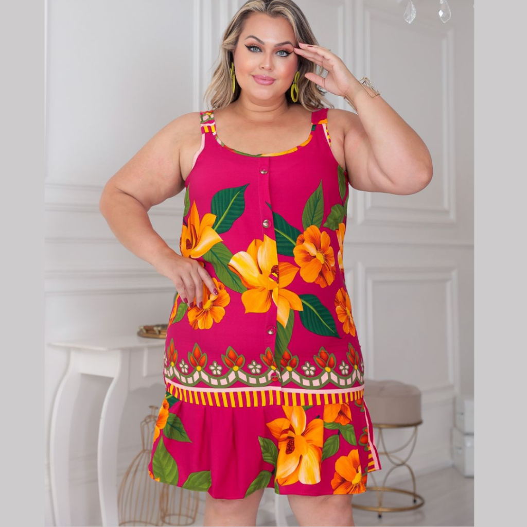Vestido Plus Size de Viscose Estampa Pink e Laranja Silvia INL