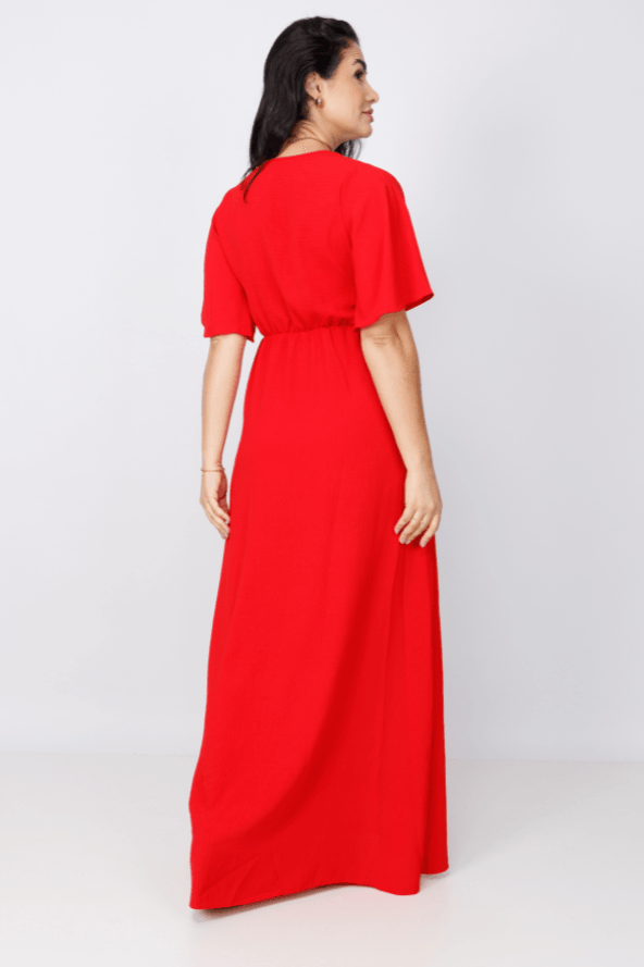 Vestido Envelope longo Vermelho Transpassado com Fenda na Perna Decote VL