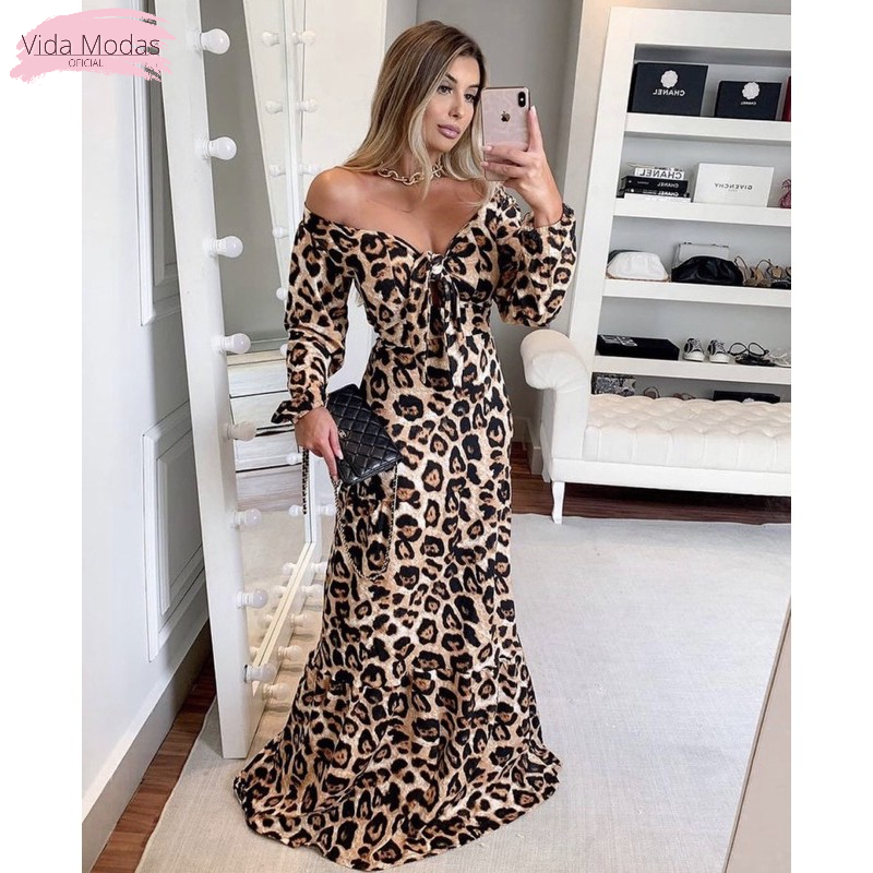 Vestidos longos de clearance inverno 2019, vestido longo Animal print oncinha com amarra o no decote e manda longa clearance