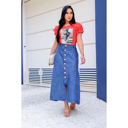 Saia jeans longa com botao na frente moda Shopee Brasil