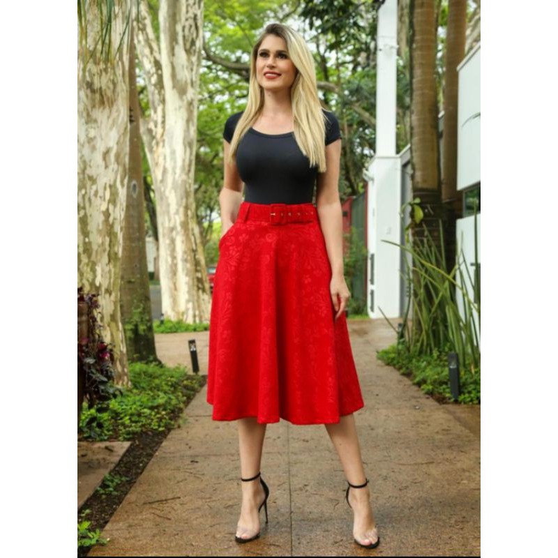 Saia God Jacquard Mid Com Cinto Cor Vermelha Moda Evang lica