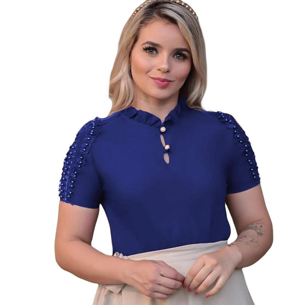 Blusa Social Feminina Crepe Manga Curta Com La o Barata Bl25
