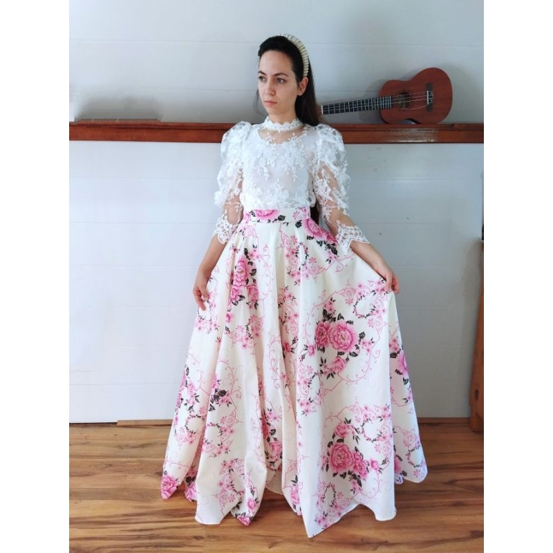 Saia longa volumosa god duplo moda evang lica festa estampada