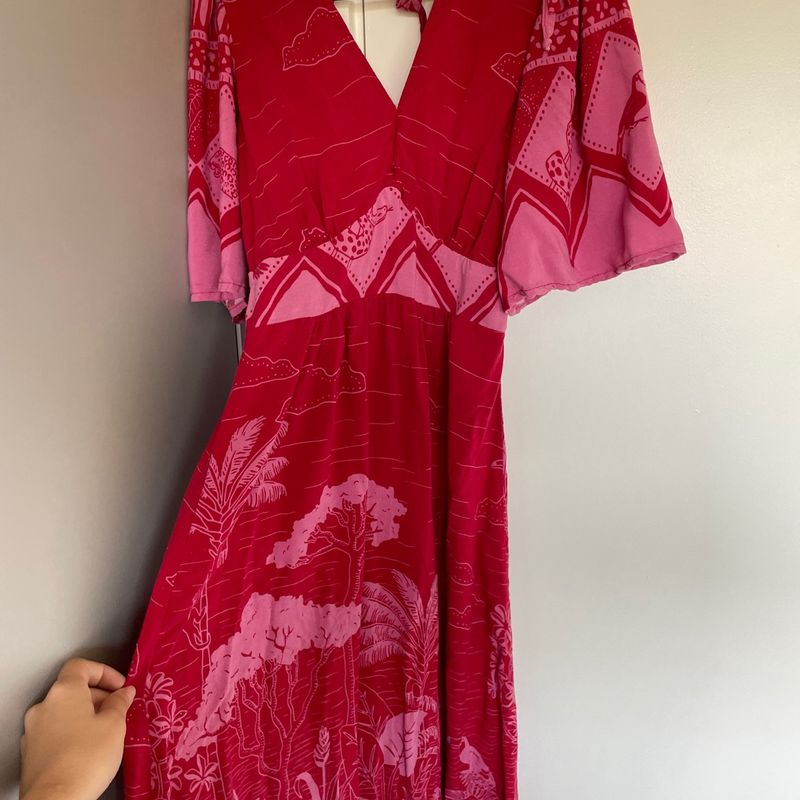 vestido longo de viscose estampado flor de jambo com babado manga