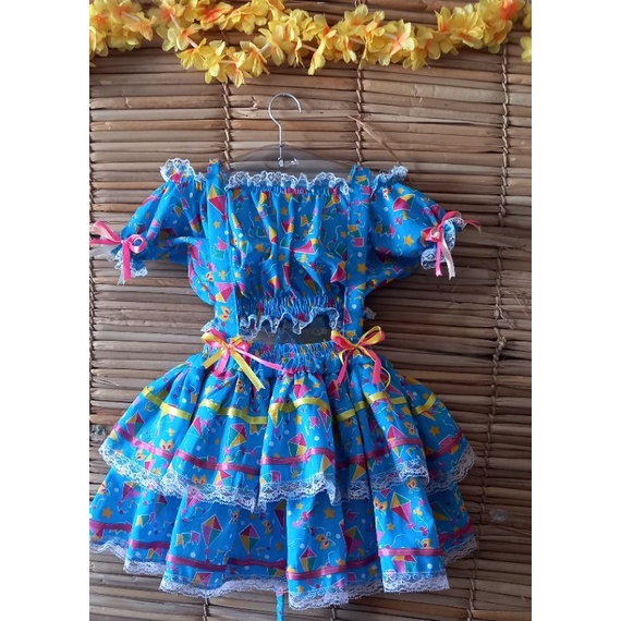 Saia e blusa clearance caipira infantil, Roupa Festa Junina Conjunto Azul Caipira Infantil conjuntinho clearance