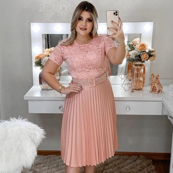 Vestido midi saia plissado busto de renda manga 3 4 Ref. 2430