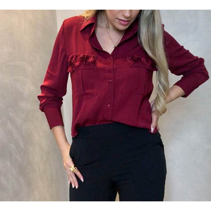 Camisa Social Manga Longa em Crepe e Renda Vermelha moda roupas