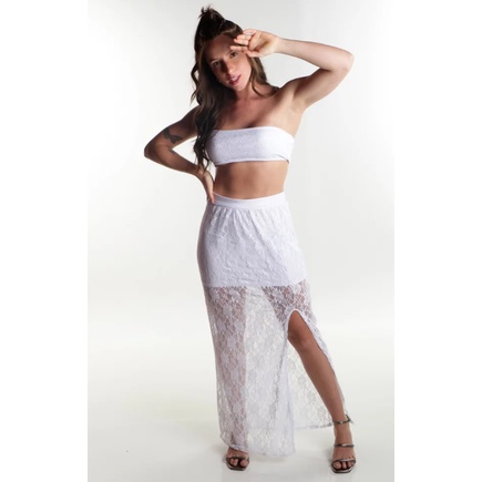 Conjunto Feminino Cropped Tomara que Caia Saia de Renda Branco R veillon Ano Novo Praia Ver o
