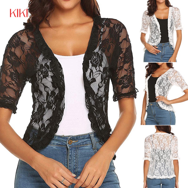 Moda feminina elegante bolero encolhendo meia manga renda croch
