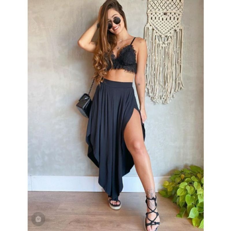Conjunto Saia Longa Fenda Cintura Alta Com Cropped Argola Miss