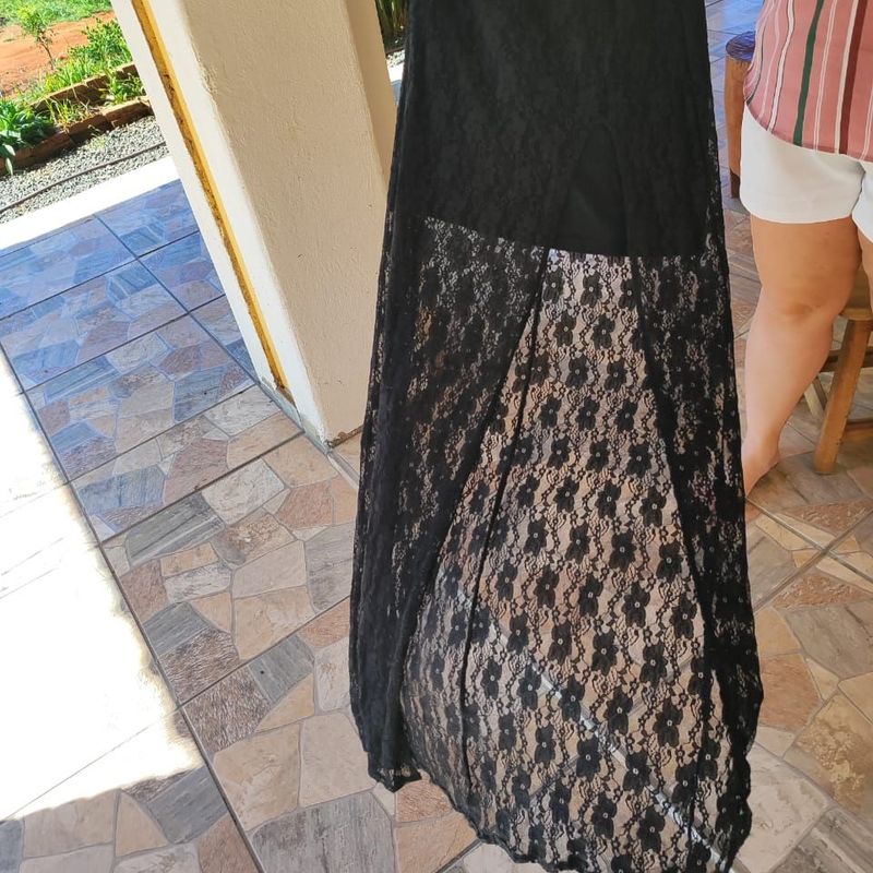 Saia longa preta clearance com renda, Saia Longa Preta com Renda e Fenda Na Lateral Saia Feminina clearance