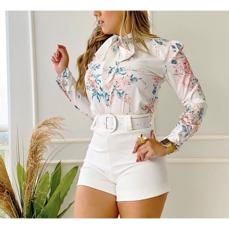 Blusa Feminina Social Florida Com Amarra o Na Gola
