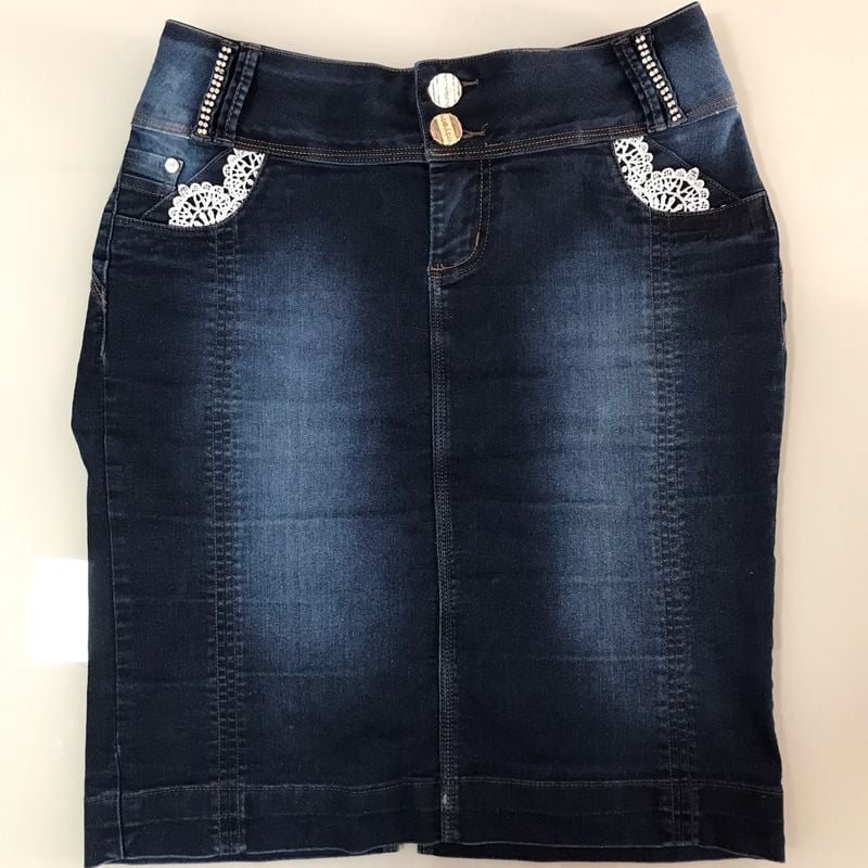 Saia jeans com clearance guipir, Saia Jeans da Marca Aud cia com Detalhe em Guipir e Strass Tecido Elastano Moda Evang lica Saia Feminina Audacia Usado 75923386 enjoei clearance