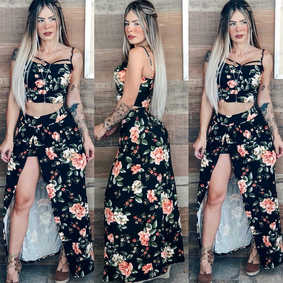 Conjunto Feminino Cropped e Saia Longa com Short Embutido