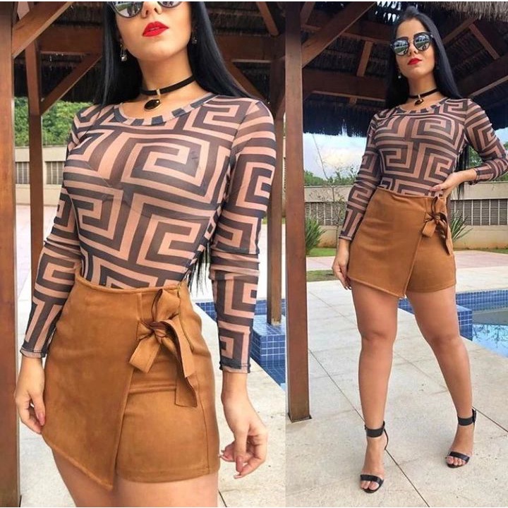Conjunto suede cropped manga longa gola alta boba e short saia