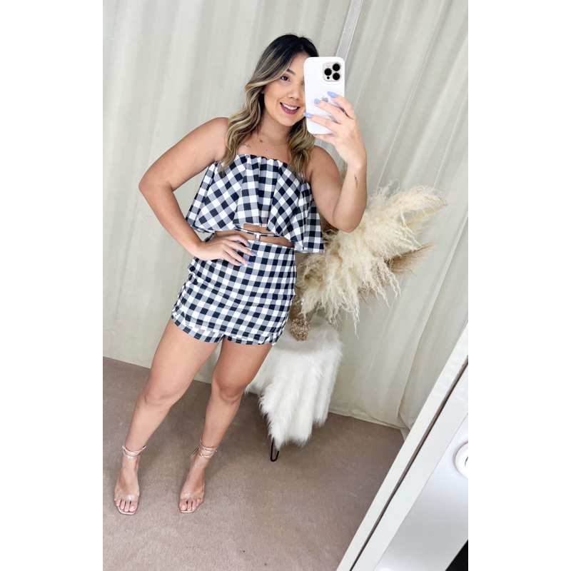 Conjunto short saia cropped babado xadrex Shopee Brasil