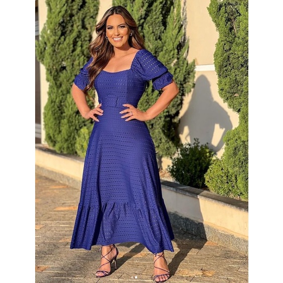vestido longo moda evangelica Tecido Malha Lese forrado azul