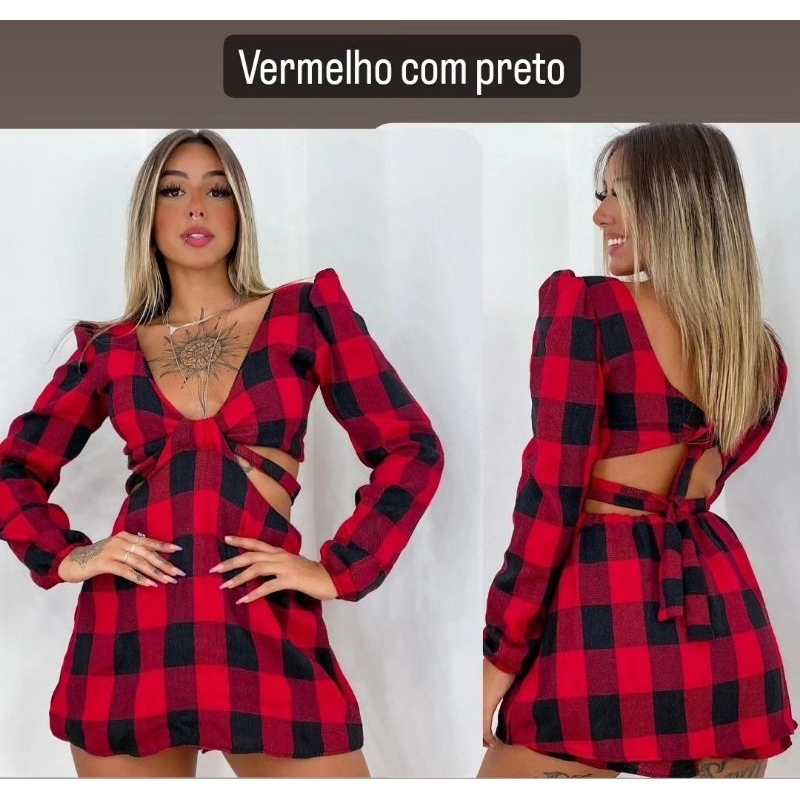 vestido macaquinho estampa xadrez manga longa Flanelado festa