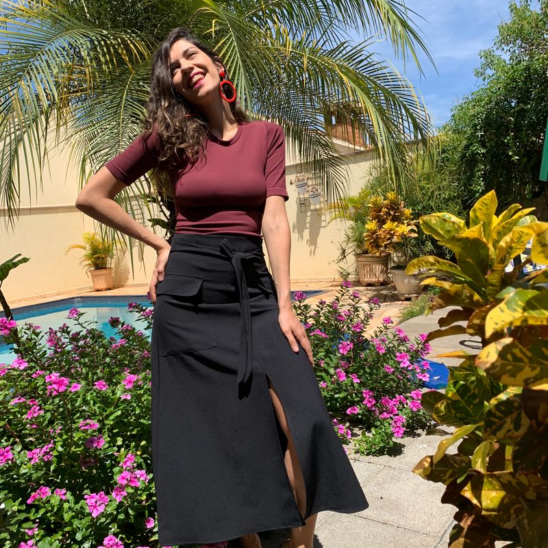 Saia midi crepe clearance preta, Saia Midi com Cinto Malha Crepe Lunender clearance