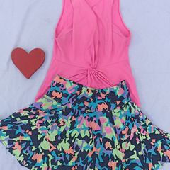 Saia plissada rosa clearance neon, Conjunto com sobreposi o top e saia plissada lateral clearance