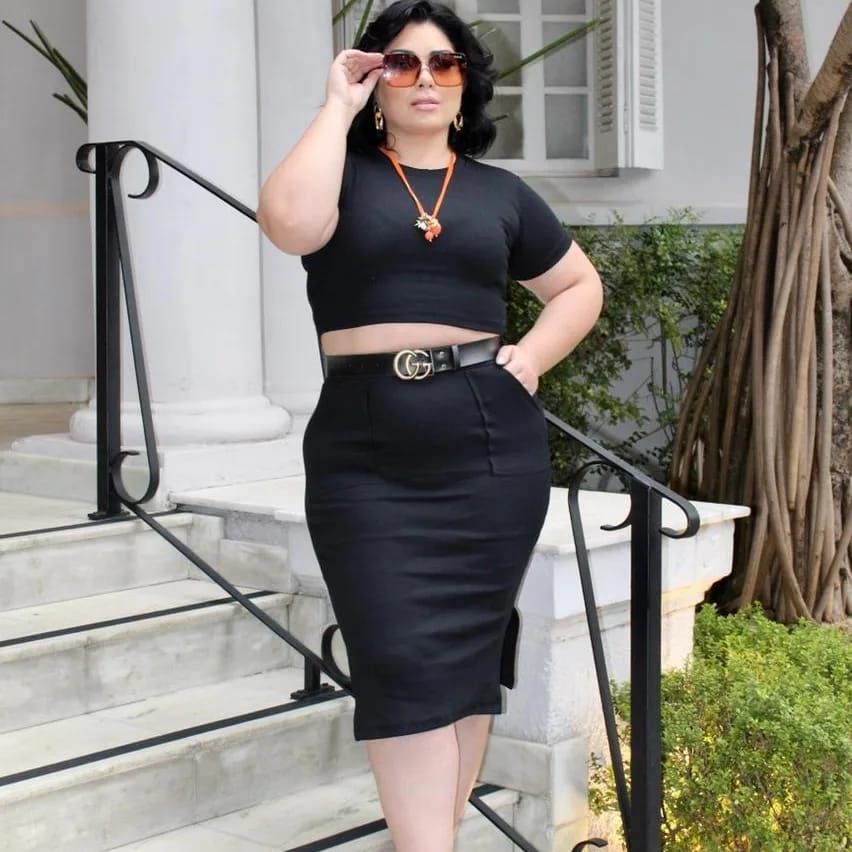 Conjunto Plus Size Saia Midi E Cropped Com Fenda Lateral Moda