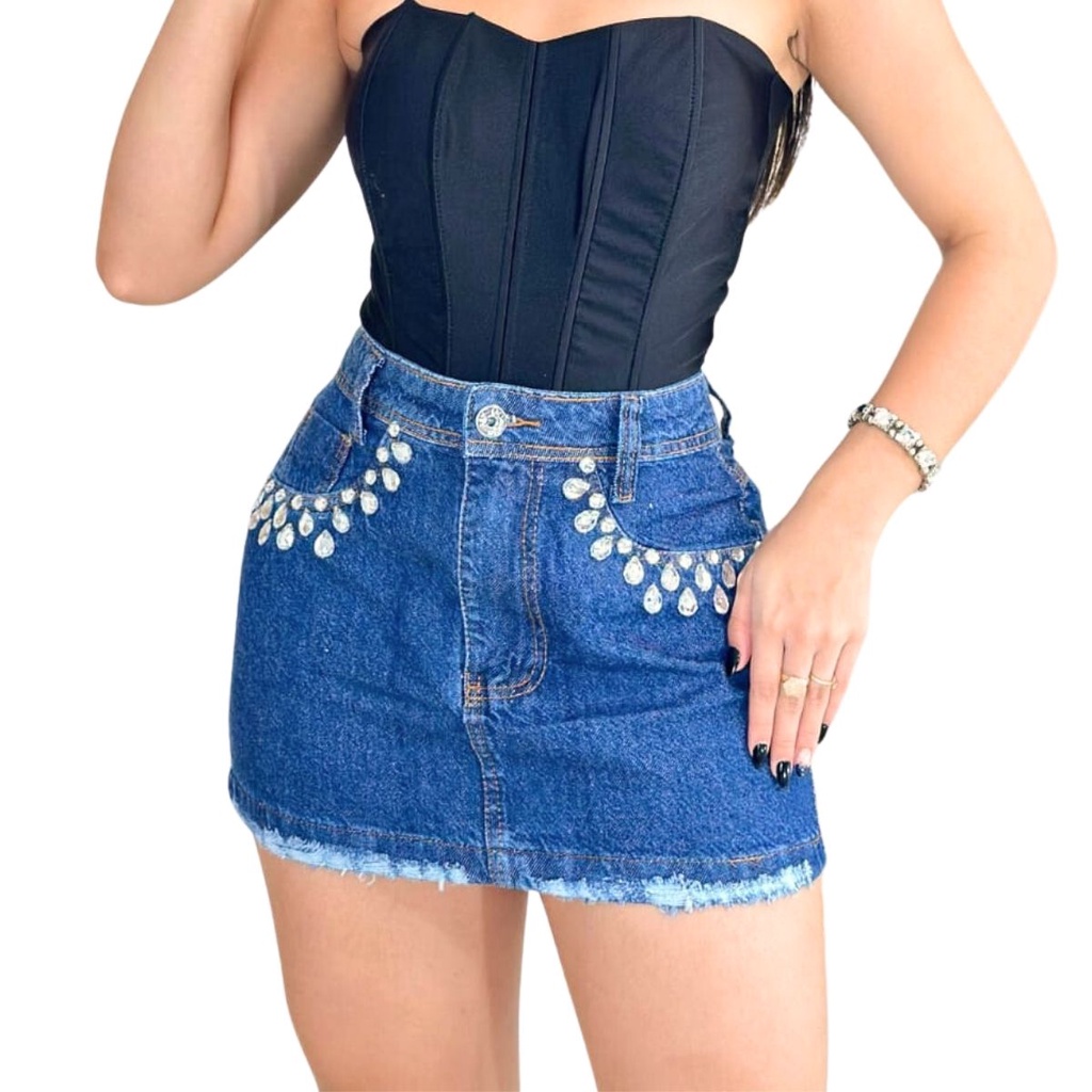 Saia Jeans curta cintura alta feminina com detalhes em pedraria