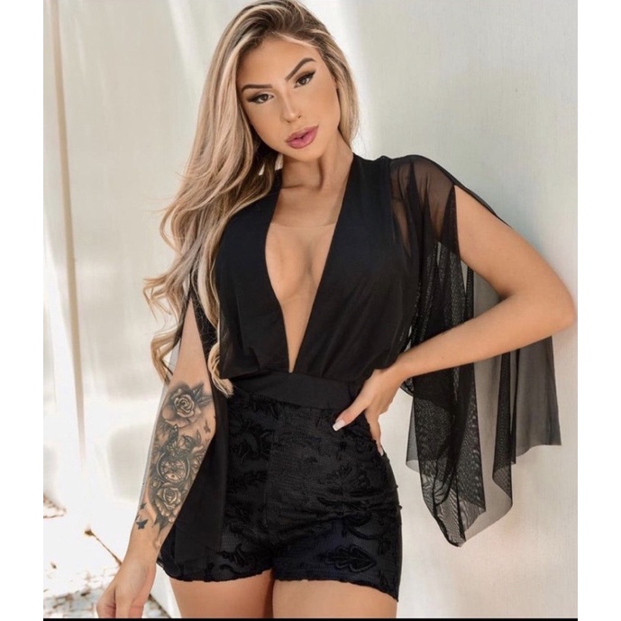 Macaquinho Decote profundo Tule paete brilho moda balada festa chique Tend ncia promo o