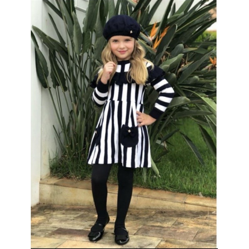 Vestido de Frio Inverno Infantil Listrado de L com Boina