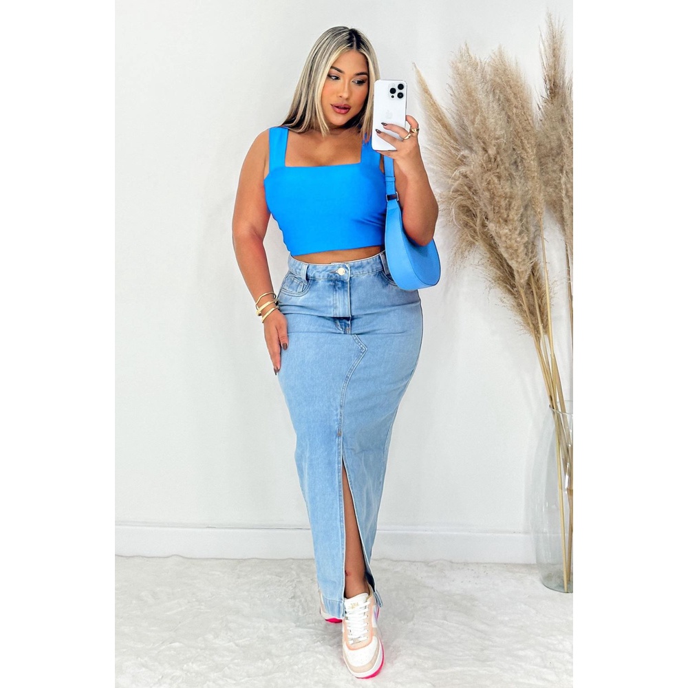 Saia Sol Jeans Midi Rasgada Com Lycra Abertura Frontal Feminina