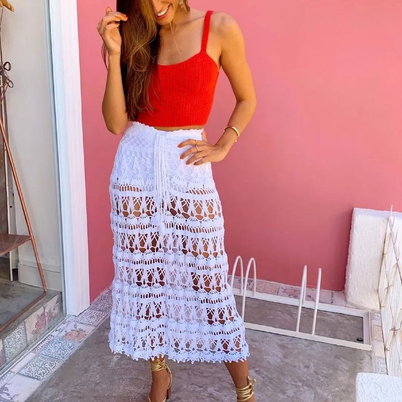 look branco Saia de croch Vestidos especiais Saia longa de croche
