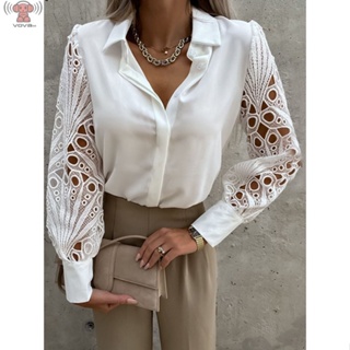 Camisa Feminina Chique Vintage Com Renda Oca Branca Manga Longa