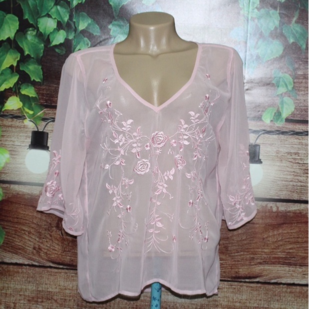 Camiseta Feminina Tecido Fino Transparente Rosa Manga 3 4 com Bordado Floral 3