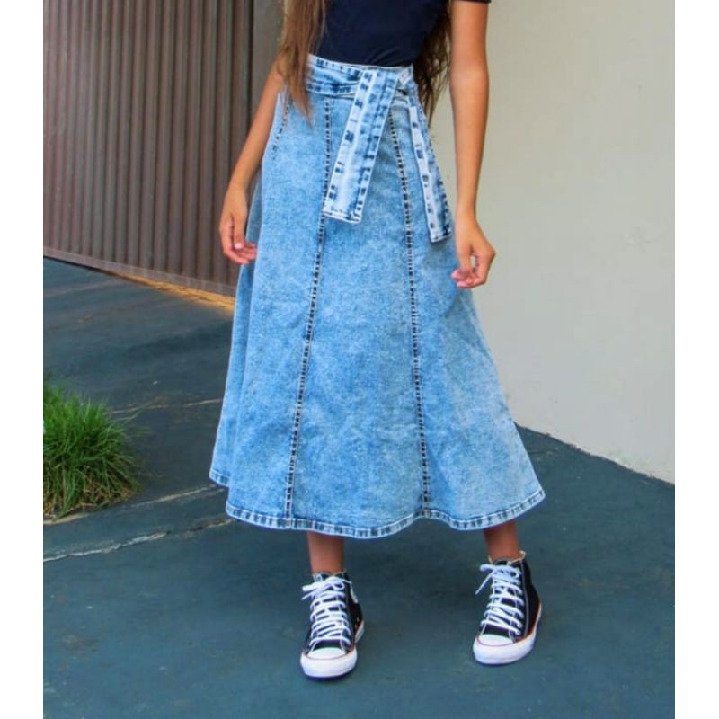 Saia Jeans Tamanho 36 Midi Soltinha Rodadinha Evas Lavagem Clara Com Amarra o Cinto na Cintura Challot Hadock Moda Feminina Evang lica