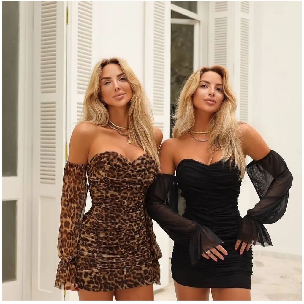 Vestido Tule Drapeado Curto Justo com manga longa moda festa balada Noite