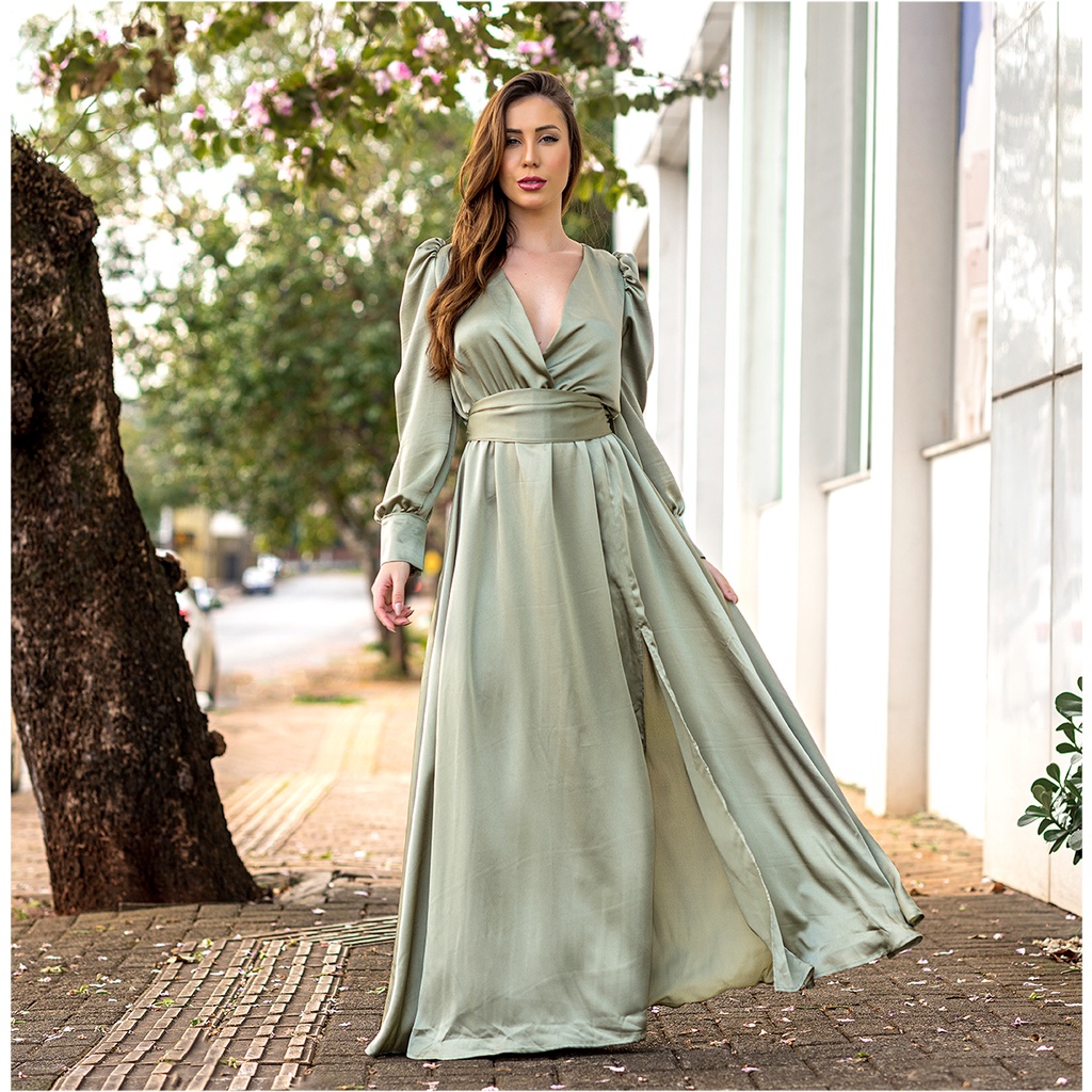 Vestido Longo de Casamento Madrinha Formatura Fenda Frontal Decote V Manga Longa Bufante