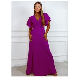 Vestido Longo Manga Curta Babado Festa Madrinha Elegante