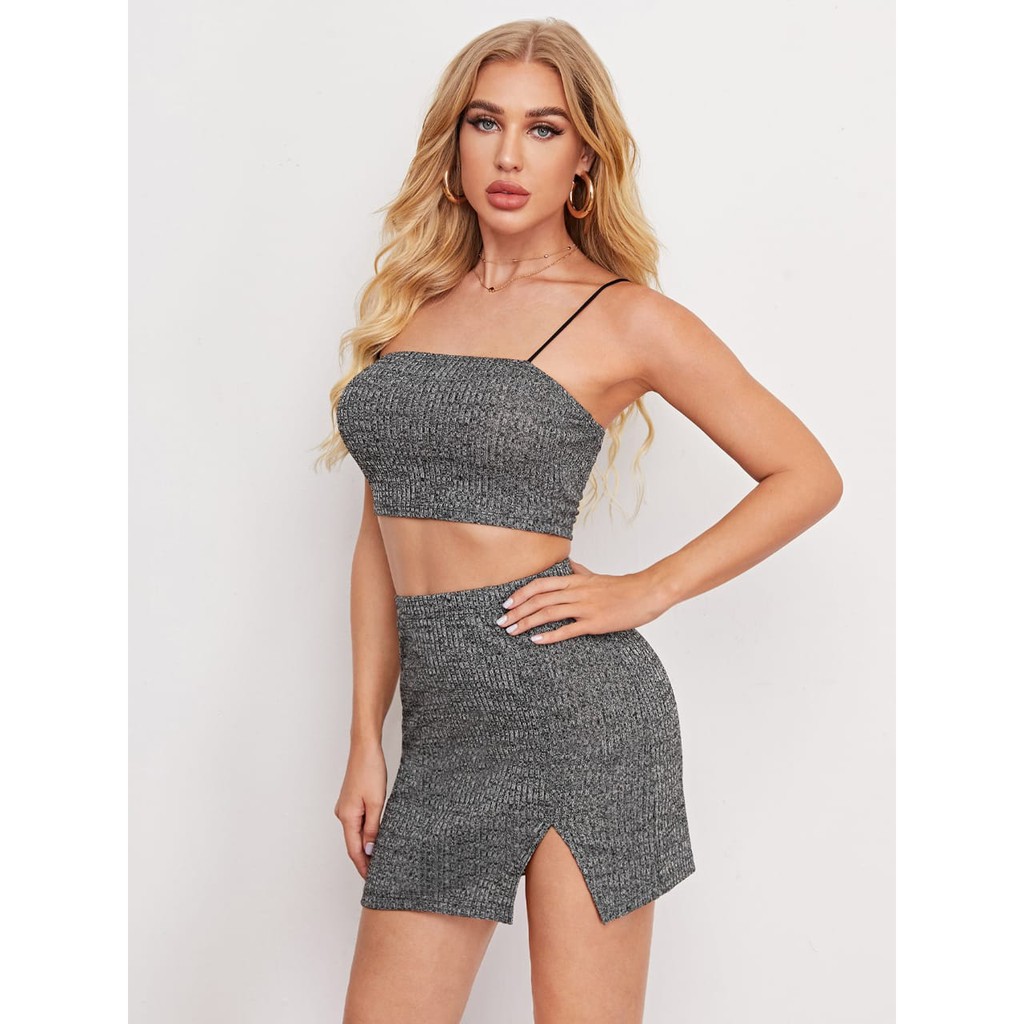 Conjunto Saia Justa Cintura Alta Slim Fit Anos 90 Coreana Curta e Top Cropped de Malha Cinza Festa Clube Feminino 2p s Shein Aesthetic Vintage