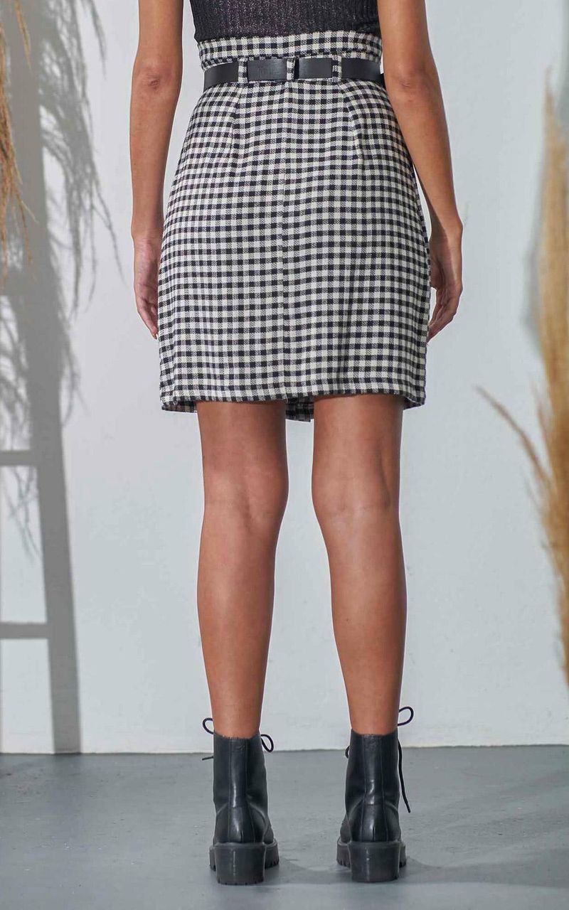 Saia Curta Evas de Cintura Alta Xadrez Bege Lanca Perfume