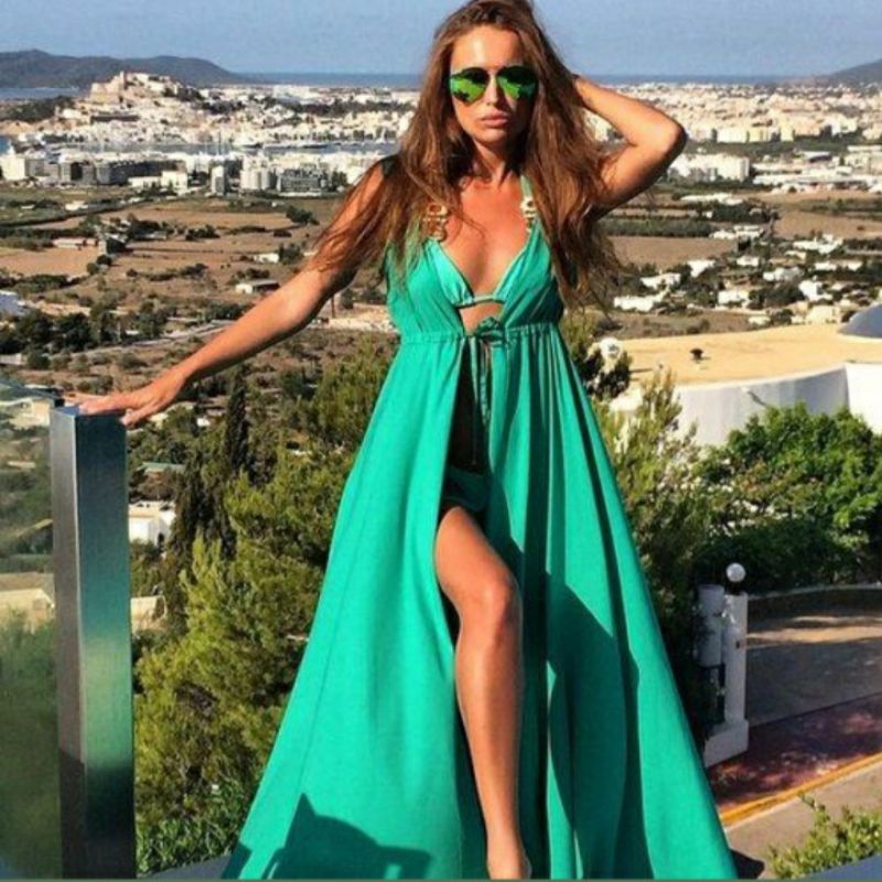 Sa da de praia longa com renda frente aberta e com amarra o