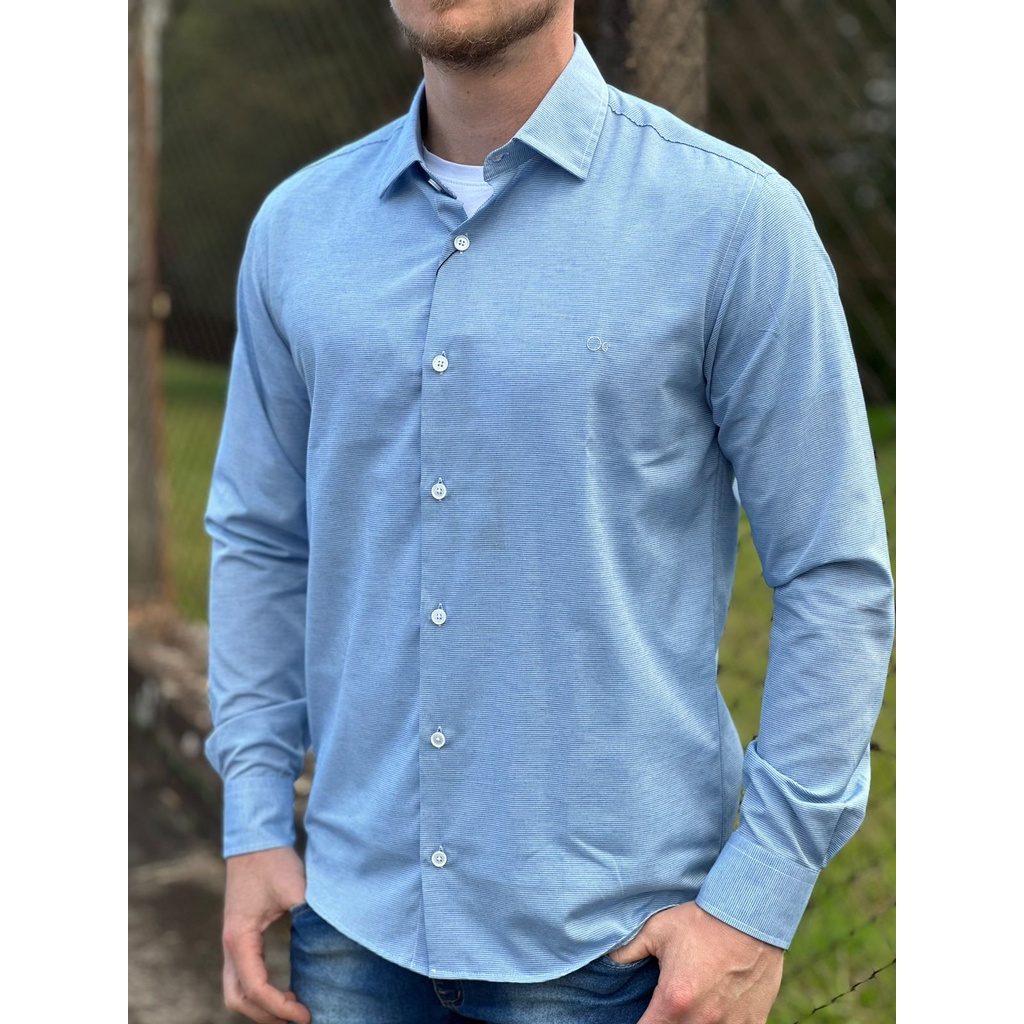 Camisas clearance ogochi atacado, Camisa Ogochi Slim Casual Azul Riscada clearance