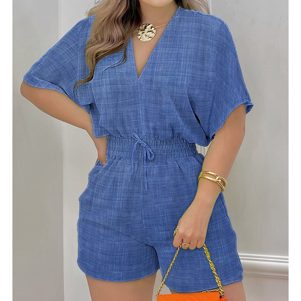 Estilo de macacao clearance curto, Macac o De Moda De Ver o Fato De Salto Impresso Feminino Casual Solto Em V De Pesco o Curto El stico De Manga Curta El stica De Cintura Alta clearance