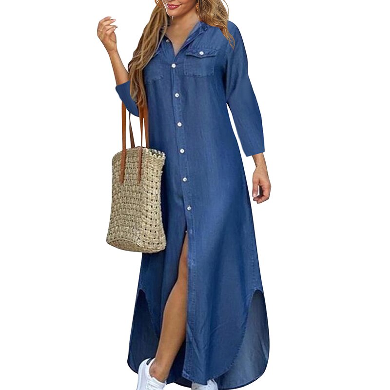 Vestido clearance longo camisa, Vestido longo outono 3 4 manga camisa vestido feminino jeans vestidos longos bolso bot o azul s lido vestidos soltos casuais clearance