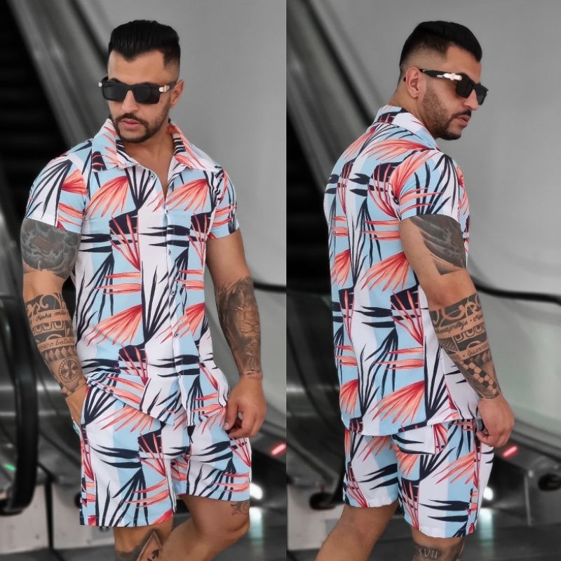 Roupa clearance praia masculina, Conjunto Praia 2 Pe as Camisa e Shorts Masculino Com Elastano Moda Praia clearance