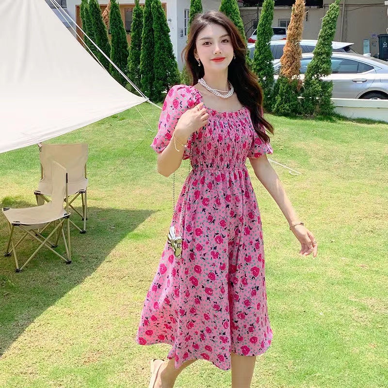 Saia longa rosa clearance cha, Saia Longa Floral Vermelha Com Manga Bufante Para Nicho Ch clearance