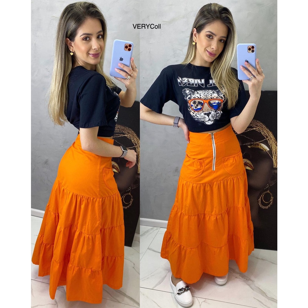 Saia longa viscose camadas babados laranja Lavinny Store