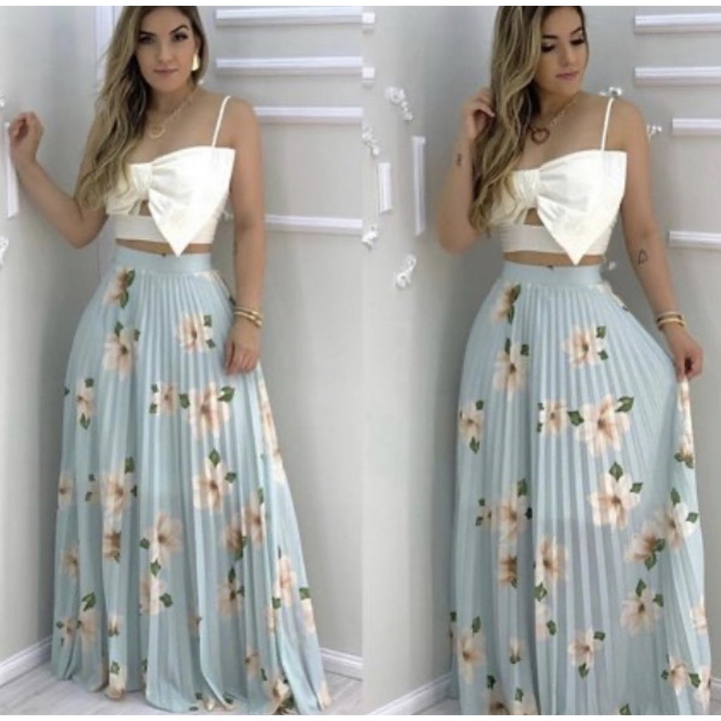 Saia longa florida clearance azul, Saia Plissada Longa Estampada Diversas Cores Emp rio Store clearance