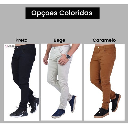 kit 3 calca sarja jeans masculina slim com lycra colorida