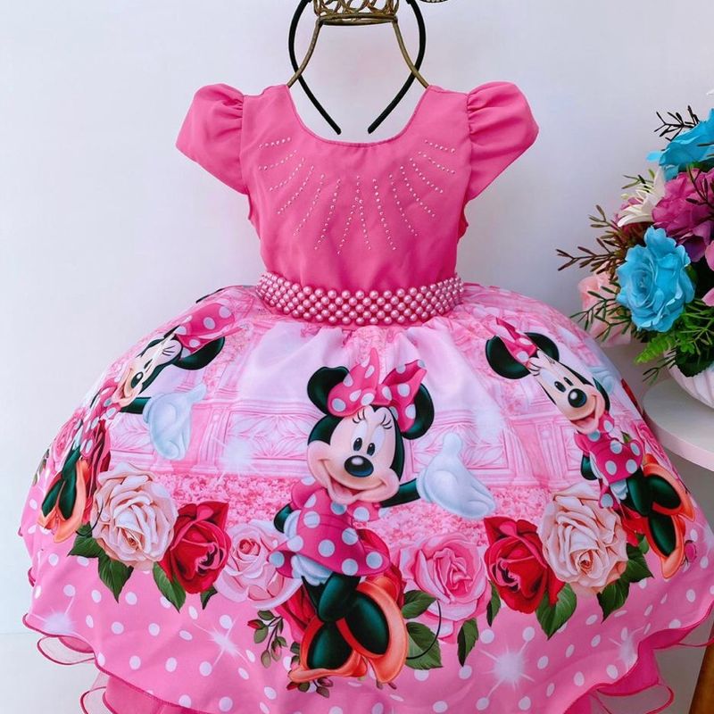Vestido Luxo Minnie Rosa Festa Roupa Infantil para Menina Nunca
