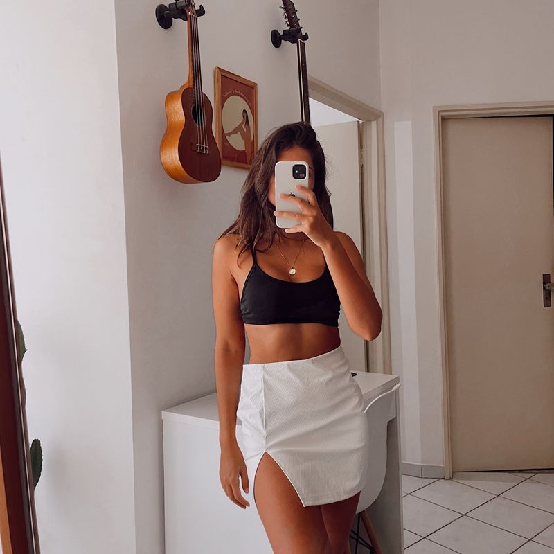 Saia couro fake clearance branca, Saia Couro Fake com Strass clearance